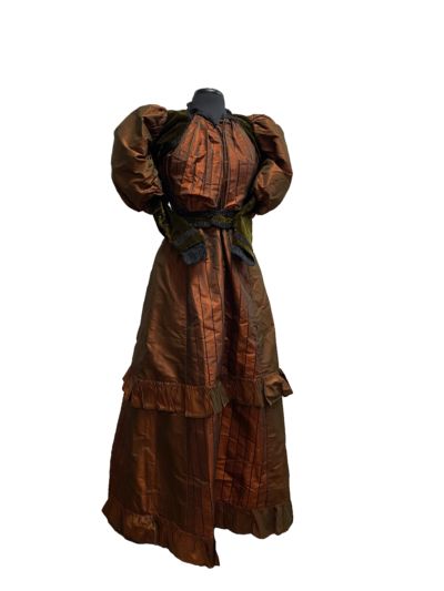One particular piece, though, stands out in my mind. It’s slim shirtwaist and collar are accentuated by the smallest black beadwork while the skirt features two large ruffles. The leg-of-mutton sleeves were all the rage in the 1890s, as the bustle began to de- crease and fashion shifted from an exaggerated posterior to an exaggerated shoulder. Made of copper-colored silk and deep green silk velvet, one would not immediately think of it as a wedding gown.
